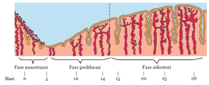Fase ketiga adalah fase sekretori. Folikel yang telah melepaskan sel telur akan berubah menjadi korpus luteum. Sel telur yang telahterjadi fertilisasi), maka akan dikirimkan sinyal tertentu pada korpus luteum untuk tidak memproduksi hormon estrogen dan progesteron lagi. Dengan demikian, pada fase ini jumlah hormon estrogen dan progesteron pada perempuan rendah. Rendahnya hormon estrogen dan progesteron menyebabkan jaringan penyusun dinding rahim rusak dan pembuluh darah yang ada pada dinding rahim pecah, sehingga perempuan akan mengalami menstruasi.