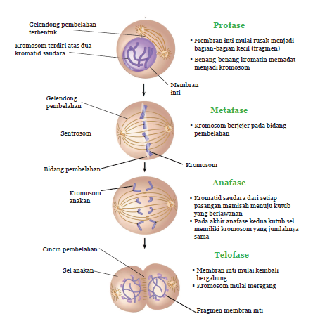 Proses mitosis terbagi menjadi beberapa tahap, yaitu :