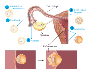 6. Fertilisasi dan KehamilanFertilisasi merupakan proses peleburan inti sel sperma dan sel telur sehingga membentuk zigot. Proses ini terjadi di tuba fallopi.Zigot yang terbentuk setelah terjadinya fertilisasi akan melakukan pembelahan, selanjutnya berkembang menjadi embrio yang akan menuju ke rahim kemudian tertanam (implantasi) ke dalam